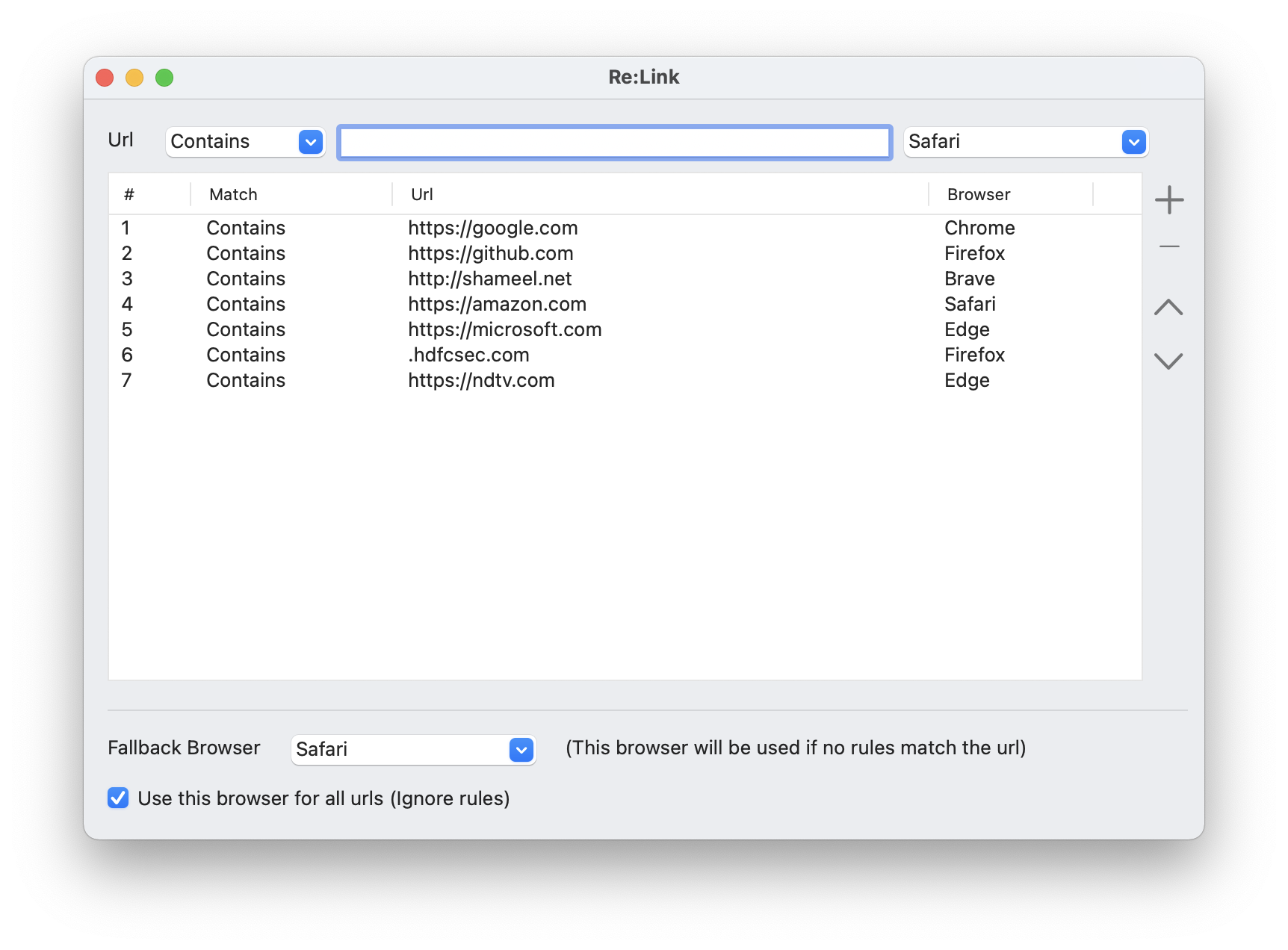 Re:Link is a Browser, except that it doesn’t open any website; instead, it redirects the request to other installed browsers in the system based on predefined customizable rules.